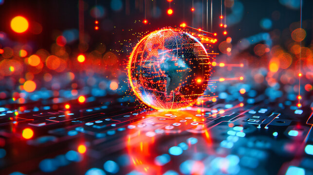 A glowing blue and red globe with lines of code and connections symbolizing global digital network.