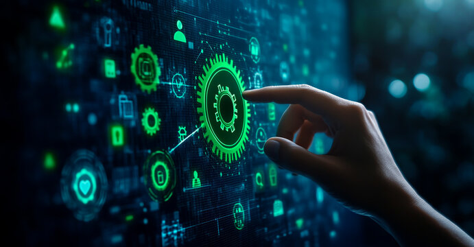 Hand interacting with digital interface displaying security lock wifi and email icons on dark background