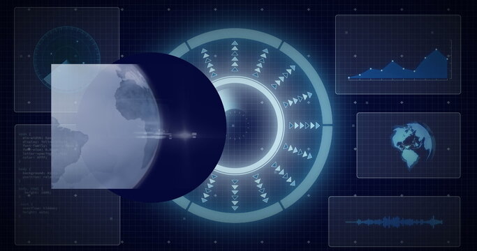Digital data processing across a connected globe showcasing global networks and illuminated continents, digital data processing over globe with connections on black background