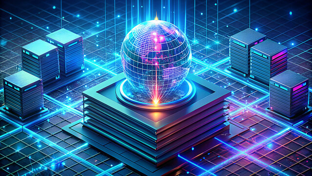Futuristic digital globe with data streams and servers
