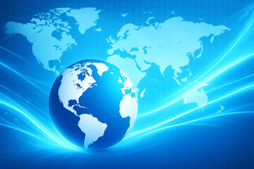 Futuristic glowing globe with world map and blue streaming lines representing global network