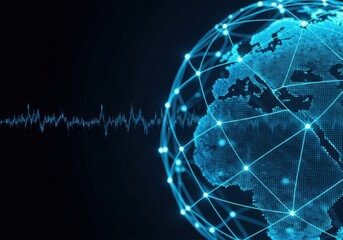 Futuristic globe with blue light trails sweeping across a grid landscape.