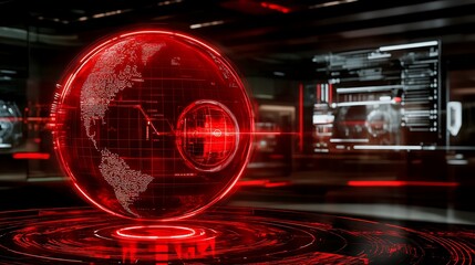 Futuristic, glowing red globe with digital interface, dark background, data streams