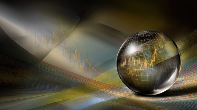 Digital globe with metallic molecular nodes and candlestick chart overlay in sepia