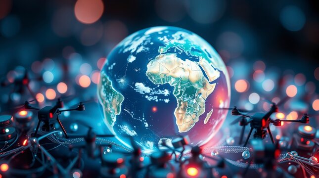 Digital rendering of earth with glowing blue lights, showcasing global connectivity and technological advancement