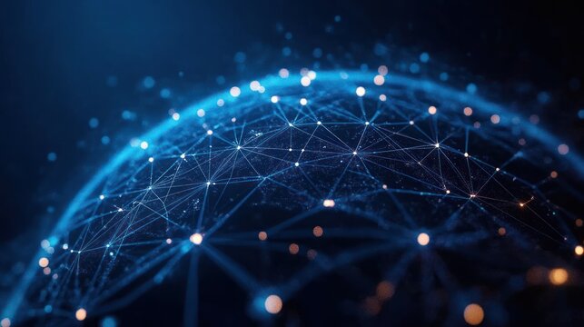 Abstract glowing network of interconnected points and lines forming a digital globe on dark blue background, symbolizing global communication and data connections
