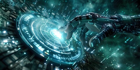 Futuristic clock overlay displaying digital globe and cyber circuit interface