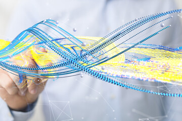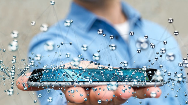 Businessman holding abstract connection interface over phone 3D
