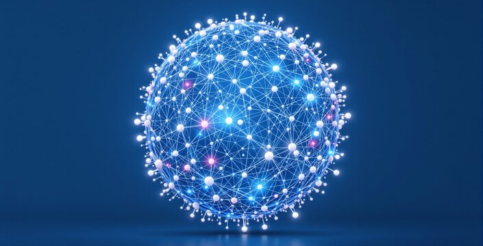 Glowing sphere of connected white nodes and lines forming a digital network structure in creative abstract style on a blue background. Ai generative