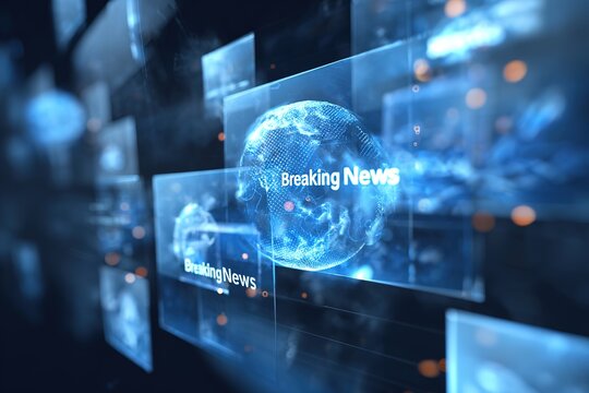 digital globe (planet Earth) with Breaking News text on numerous fast-moving virtual screens or panels on a dark blue cybernetic background with a depth of field effect