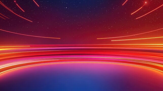 Futuristic light trails creating a sense of speed and data movement across a vibrant gradient background with starfield elements, suitable for technology and digital concepts