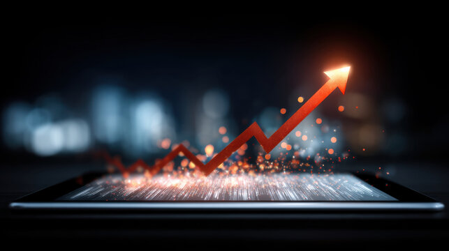 Digital tablet displays rising graph with glowing arrow, symbolizing growth and success in business or finance. background features blurred cityscape, enhancing theme of progress and innovation