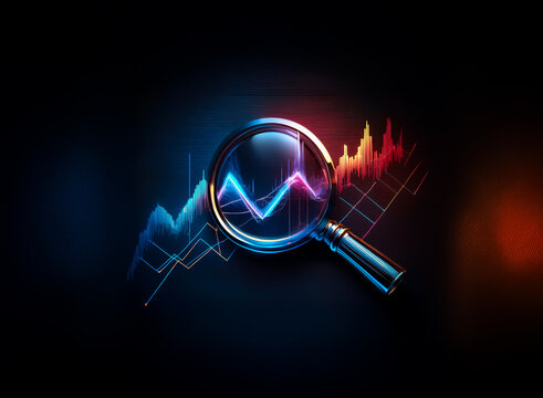 A magnifying glass focuses on a vibrant line graph with neon blue, pink, and orange hues against a dark backdrop, symbolizing analysis and data investigation.