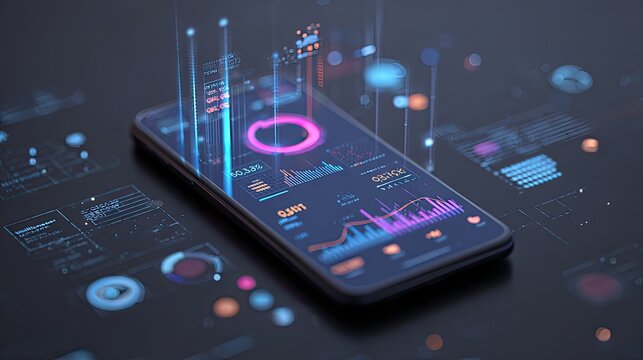 Dynamic digital interface on smartphone displaying vibrant financial analytics and growth charts, showcasing modern data visualization for business intelligence and investment insights