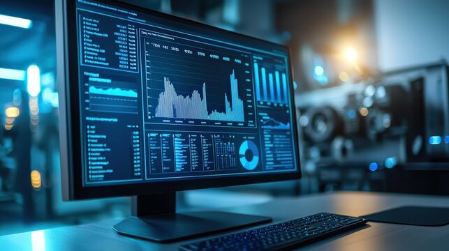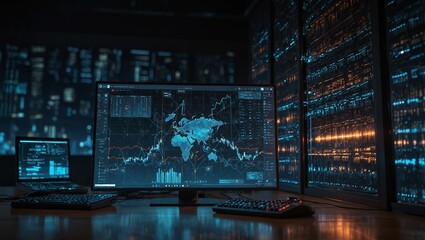 Advanced workstation with multiple screens displaying data analytics