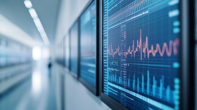 modern office corridor with large monitors displaying data and graphs, technology innovation and digital transformation concept.