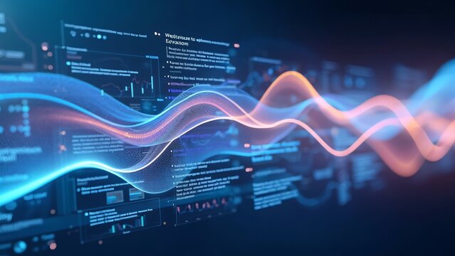 A dark blue background with glowing data visualization graphics of graphs and charts. The focus is on the holographic appearance of digital bar graphs,