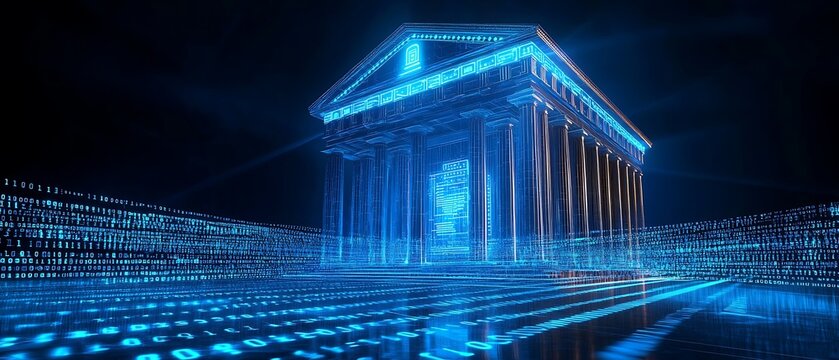 Futuristic digital bank, Greek temple hologram, binary code, dark background, AI tech concept