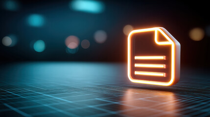 Digital document icon glowing on futuristic grid background with warm light and bokeh