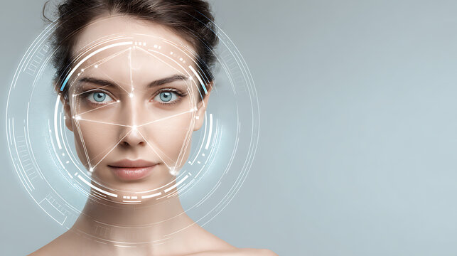 A woman's face with futuristic digital interface overlay, highlighting facial features with holographic elements