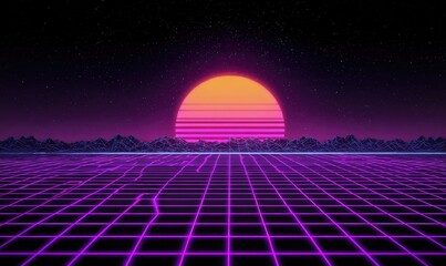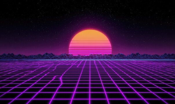 Synthwave landscape. A fiery orb sets above pixelated mountains, reflecting on a grid-like surface