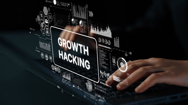 Hands On Laptop Keyboard Displaying Concept Of Growth Hacking With Data Visualization And Analytics. Asymptotic smart data analytic.