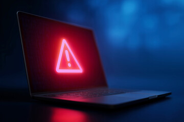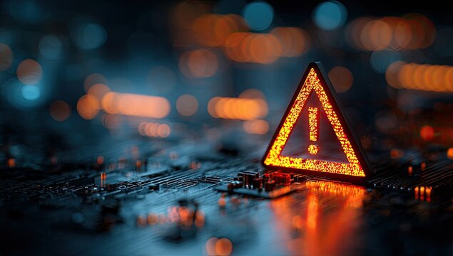 A glowing red warning triangle with an exclamation mark on a dark digital background, symbolizing alert, error, or cyber security threat.