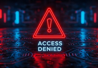 Digital warning sign with red neon exclamation mark and access denied text on a circuit board background with blue and red lights
