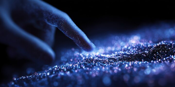 A hand touches a glowing field of particles. Dark background with blue and purple hues
