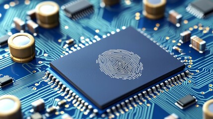circuit board, components, functional Close-up of a microchip featuring a fingerprint design on a blue circuit board.