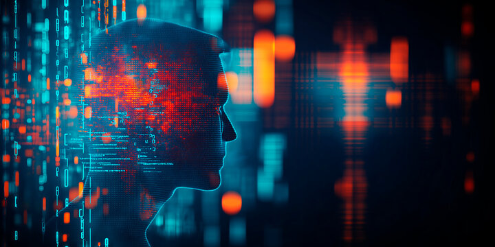 A digital silhouette of a human head is illuminated against a backdrop of binary code, symbolizing the intersection of humanity and technology.