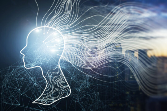 Futuristic digital concept with virtual human head and light trails