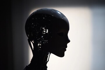 Silhouette of a futuristic robot head set against a dark background in striking photography