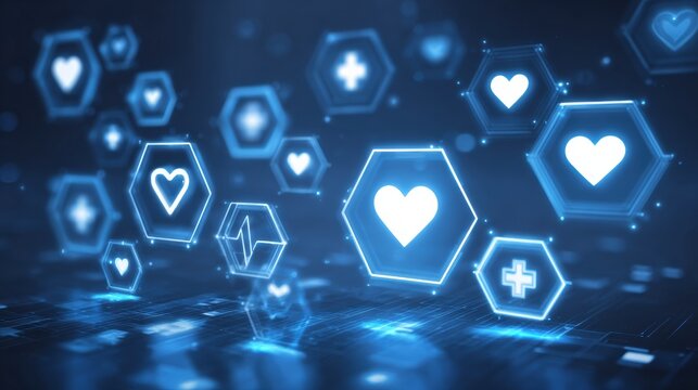 Digital Health Icons in Blue Tones With Hexagonal Shapes Representing Wellness and Medical Concepts in a Modern Design