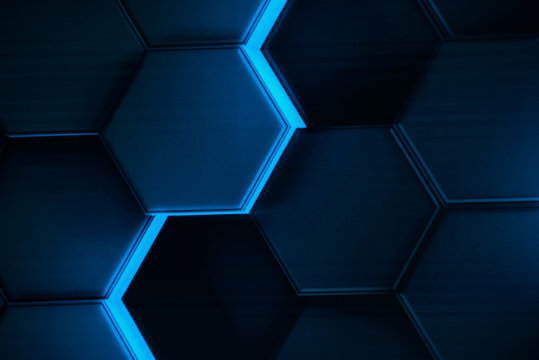 Glowing black and blue hexagons background pattern on silver metal surface 3D rendering