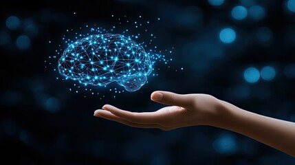 A hand reaches out towards a floating digital brain network, representing the intersection of technology and human intellect in a contemporary context