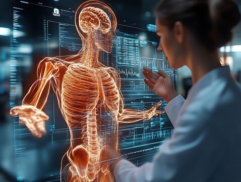 Doctor holding tablet with human body. Holographic projection of a healthcare professional tablet. Human internal anatomy model. A physician carrying a tablet displaying a human figure lifestyle.