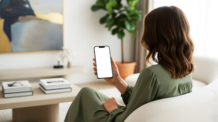 Hand holding mobile phone with blank white screen mockup in modern luxury living room, woman sitting on sofa using smartphone for smart home apps and digital lifestyle interface design.