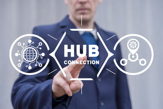 Man using virtual touch screen presses inscription: HUB CONNECTION. Web digital networking technology. Hub Network. Information modern cloud networking connection.
