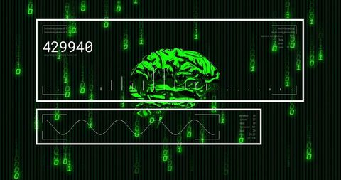 Neon green brain hud with cascading binary code and neural analytics dashboard interface