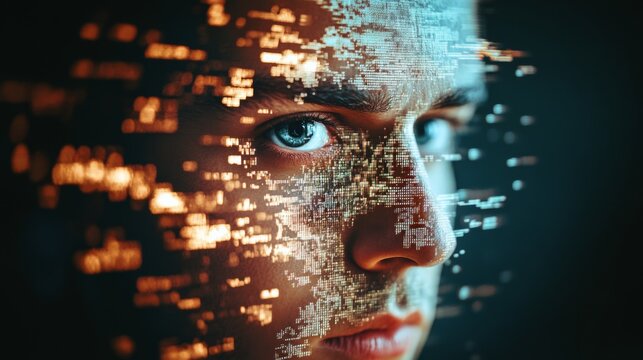 Close-up of a man's face with digital fragments, highlighting the fusion of human features and technology.