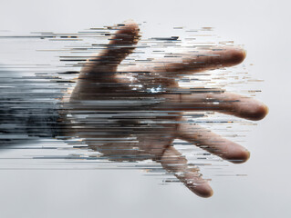 Futuristic digital transformation concept showing a human hand dissolving into horizontal pixelated lines against a clean white background with a technology theme