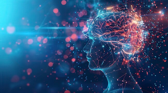 Digital human head composed of glowing data points and code, symbolizing the AI era with advanced technology and artificial intelligence concept.