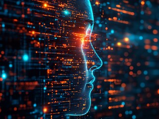 Binary code numbers that composes a human face as a metamorphosis of human and Artificial Intelligence. Conceptual image for background