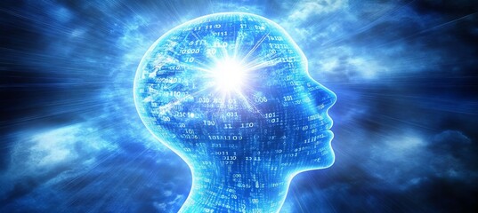 Digital human head composed of binary code against a blue background