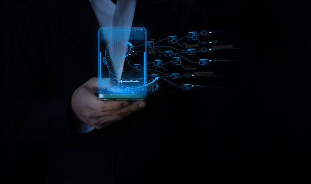 Artificial intelligence hologram head with data flow and machine learning concept on smartphone