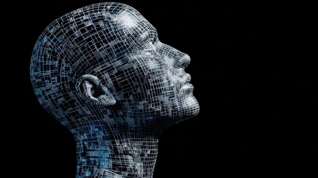 A digital representation of a human head composed of intricate lines and patterns against a black background, symbolizing technology and artificial intelligence.