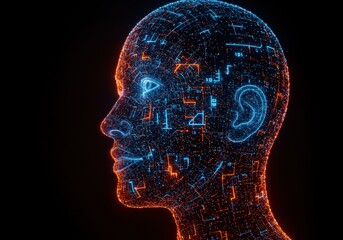 Digital head representing artificial intelligence with glowing circuit patterns on a black background