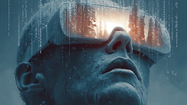 vector concept of a human face partially covered by VR goggles with a glowing digital world emerging from the lenses, surrounded by binary code and abstract shapes, Adobe vector illustration