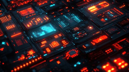 Futuristic tech interface with glowing red and blue circuits and a central screen displaying a human head.